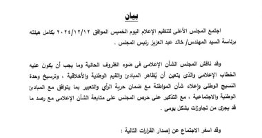 جاء ذلك بناء على ما اسفرت عنه أعمال الإدارة العامة للرصد بالمجلس الأعلى لتنظيم الاعلام من متابعة التزام المؤسسات الخاضعة لقانون تنظيم الصحافة والإعلام والمجلس الأعلى لتنظيم الاعلام بالضوابط والمعايير الصادرة عن المجلس.
