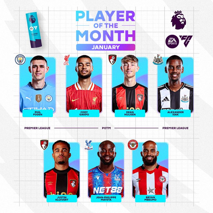 نشرت الصفحة الرسمية لرابطة الدوري الإنجليزي عبر موقع " x " اللاعبين المرشحين للفوز بجائزة أفضل لاعب في شهر يناير، وهم فيل فودين لاعب مانشستر سيتي و كودي جاكبو لاعب ليفربول ديان هويسين لاعب بورنموث وألكسندر إيزاك لاعب نيوكاسل وجاستن كلويفرت لاعب بورنموث وفيليبي ماتيتا لاعب كريستال بالاس.