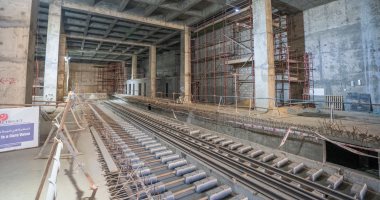 يتم تنفيذ أعمال الأساسات (الخوازيق والقواعد) والاعمدة الخاصة بالمحطات على طول مسار المشروع.