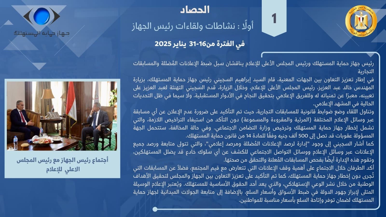 عقد إبراهيم السجيني، رئيس جهاز حماية المستهلك، لقاءًا مع المهندس خالد عبد العزيز ، رئيس المجلي الأعلي لتنظيم الإعلام لبحث ضوابط الإعلانات المُضللة والخادعة والوقف الفوري لها، والمسابقات التجارية بمختلف وسائل الإعلام، وكذا الملفات ذات الإهتمام المشترك بين الجانبين.