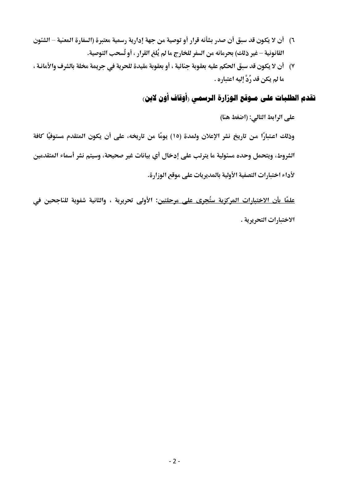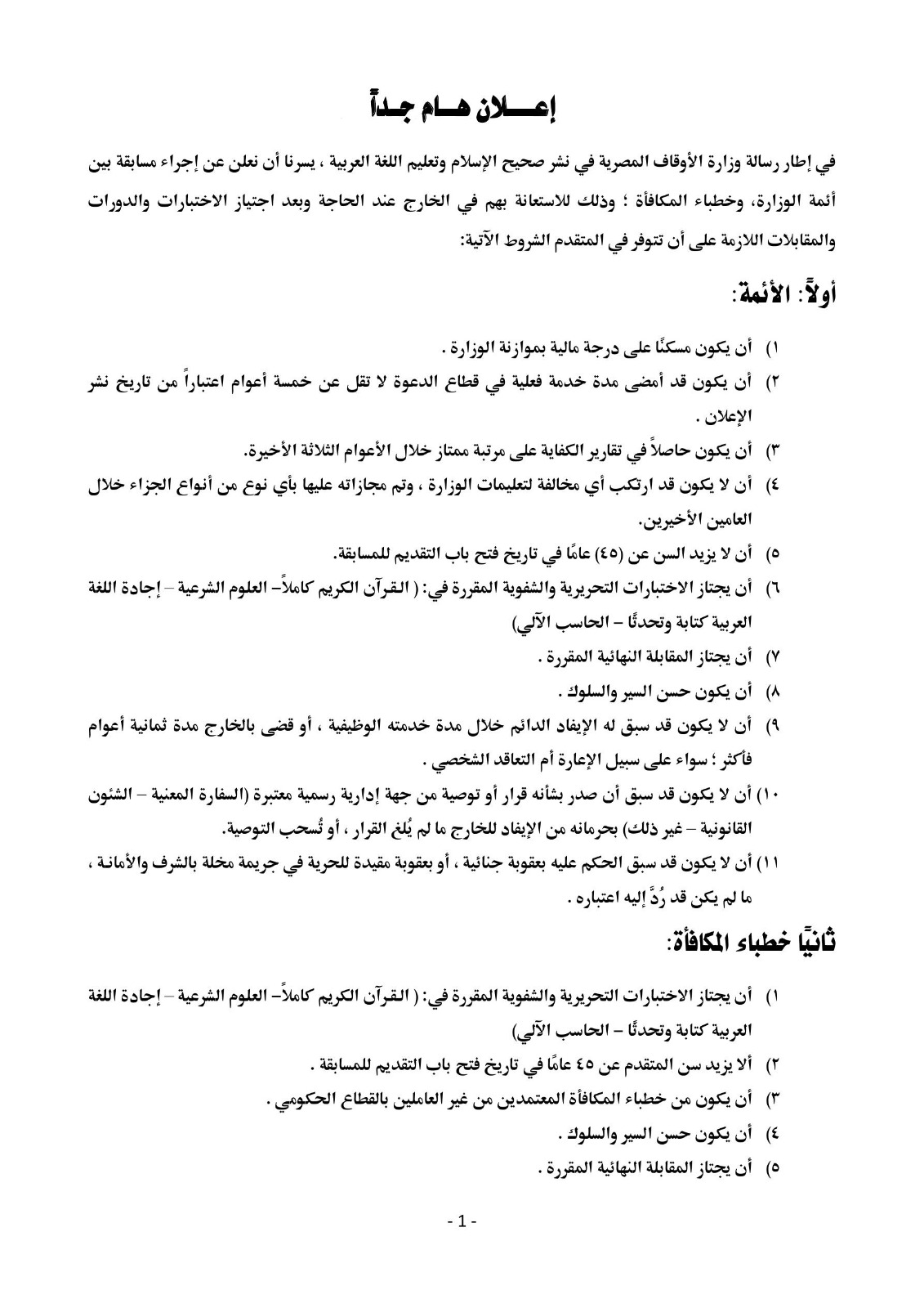 واشترطت الوزارة كذلك إلا يكون المتقدم قد ارتكب أى مخالفة لتعليماتها أُدين بسببها بأى نوع من الجزاء خلال العامين الأخيرين، وألا يزيد عمره عن 45 عامًا عند بدء التقديم، بالإضافة إلى اجتياز اختبارات تحريرية وشفوية تشمل القرآن الكريم كاملًا، والعلوم الشرعية، واللغة العربية كتابة وتحدثًا، إلى جانب مهارات الحاسب الآلي.