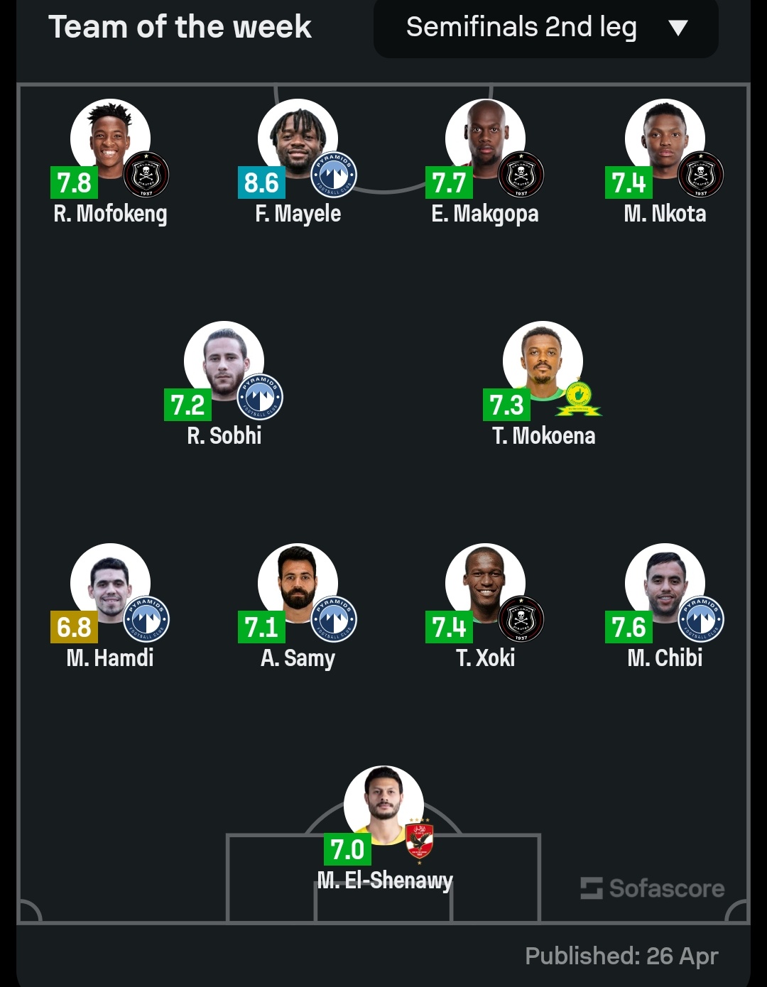 سيطر بيراميدز على التشكيل المثالي لمرحلة الإياب في الدور نصف النهائي ببطولة دوري أبطال أفريقيا، وفقًا لموقع "sofascore" العالمي.
