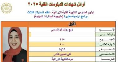 وكشفت وزارة التربية والتعليم عن قائمة أوائل الدبلومات الفنية للعام الدراسى 2024،2025، حيث قدم الدكتور أيمن بهاء نائب وزير التربية والتعليم والتعليم الفني التهنئة لأوائل شهادات الدبلومات الفنية للعام 2025 تليفونيا والذين بلغ عددهم 34 طالب وطالبة 25 طالبة و9 طلاب من 14 محافظة تضم محافظات مطروح - البحيرة - سوهاج الغربية - كفر الشيخ - الإسكندرية - القاهرة - القليوبية - الشرقية - الوادي الجديد - الجيزة - أسيوط - المنوفية . السويس.