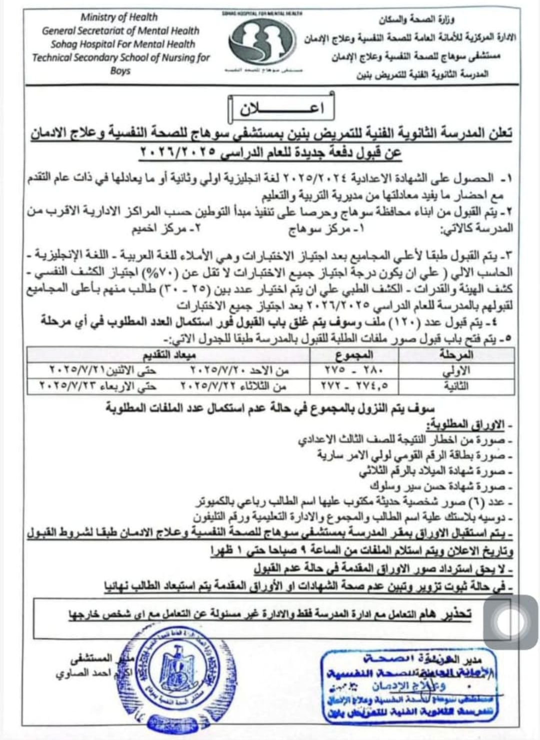 أعلنت المدرسة الثانوية الفنية للتمريض بنين، التابعة لمستشفى سوهاج للصحة النفسية وعلاج الإدمان، عن فتح باب القبول لقبول دفعة جديدة من الطلاب للعام الدراسى 2025 / 2026، وذلك وفقًا لضوابط وشروط دقيقة، فى إطار دعم قطاع التمريض الفنى بالمحافظة.