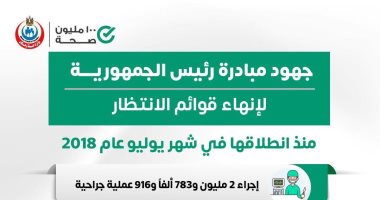 نشرت الصفحة الرسمية لوزارة الصحة والسكان انفوجراف يتضمن حصر كامل بأعمال مبادرة رئيس الجمهورية لإنهاء قوائم الانتظار للحالات الحرجة والعاجلة، حيث تم إجراء 2 مليون و863 ألفا و688 عملية جراحية ضمن المبادرة الرئاسية لإنهاء قوائم الانتظار.