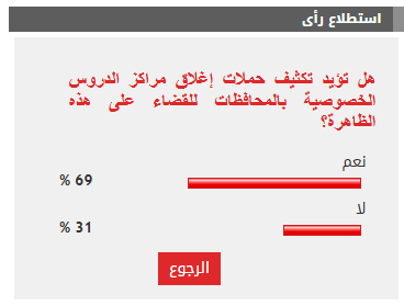 وأيد 69% من القراء مطالب تكثيف حملات إغلاق مراكز الدروس الخصوصية بالمحافظات للقضاء على هذه الظاهرة، بينما رفض 31% مطالب تكثيف حملات إغلاق مراكز الدروس الخصوصية بالمحافظات للقضاء على هذه الظاهرة.